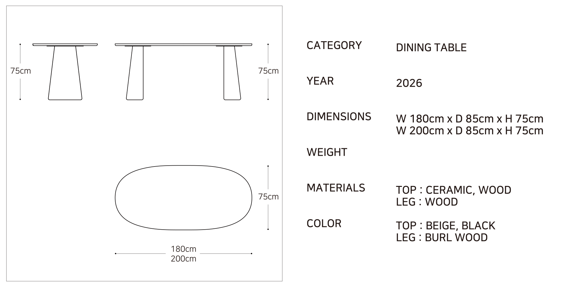 비정형의 상판과 부드러운 곡선의 다리가 어우러져 공간 속 하나의 오브제로 존재감을 드러냅니다. BURL WOOD와 세라믹 상판이 만나 은은한 분위기를 연출하는 베이지, 전체 블랙 무늬목으로 묵직한 인상을 더한 블랙, 두 가지 컬러 옵션으로 구성되어 있습니다.
