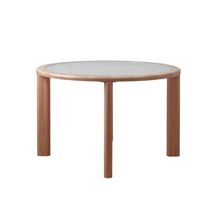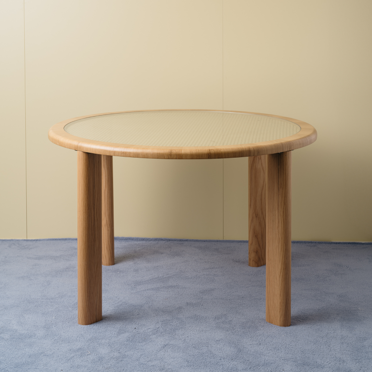 오크와 라탄, 강화유리 3가지 소재가 사용된 원형 테이블로 데스크 겸 식탁으로 활용도 높게 사용 가능합니다.