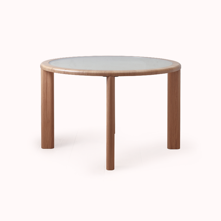 오크와 라탄, 강화유리 3가지 소재가 사용된 원형 테이블로 데스크 겸 식탁으로 활용도 높게 사용 가능합니다.