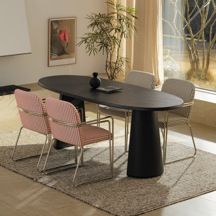비정형의 상판과 부드러운 곡선의 다리가 어우러져 공간 속 하나의 오브제로 존재감을 드러냅니다. BURL WOOD와 세라믹 상판이 만나 은은한 분위기를 연출하는 베이지, 전체 블랙 무늬목으로 묵직한 인상을 더한 블랙, 두 가지 컬러 옵션으로 구성되어 있습니다.